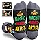 Celebrate creativity with these premium HAPPYPOP artist socks, featuring playful designs of drawing boards, brushes, palettes, and paints. The humorous 'NACHO AVERAGE ARTIST' message on the sole adds a fun touch. Made from high-quality materials for comfort, these unisex socks fit men's US sizes 6-13 and women's sizes 7+. Perfect as thoughtful gifts for artists, art teachers, or art enthusiasts for birthdays, Christmas, Father's Day, or as stocking stuffers. The stylish black design with colorful art elements makes these socks a unique way to show appreciation for the creative people in your life. Comes in a gift-ready box for easy presentation.